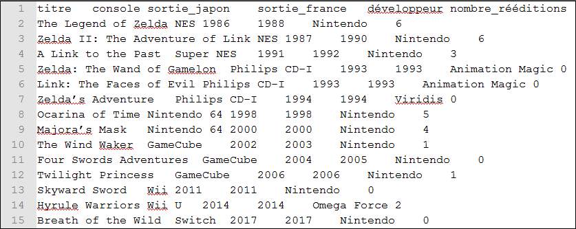 titre console sortie_japon sortie_france développeur nombre_rééditions The Legend of Zelda NES 1986 1988 Nintendo 6 Zelda II: The Adventure of Link NES 1987 1990 Nintendo 6 A Link to the Past Super NES 1991 1992 Nintendo 3 Zelda: The Wand of Gamelon Philips CD-I 1993 1993 Animation Magic 0 Link: The Faces of Evil Philips CD-I 1993 1993 Animation Magic 0 Zelda’s Adventure Philips CD-I 1994 1994 Viridis 0 Ocarina of Time Nintendo 64 1998 1998 Nintendo 5 Majora’s Mask Nintendo 64 2000 2000 Nintendo 4 The Wind Waker GameCube 2002 2003 Nintendo 1 Four Swords Adventures GameCube 2004 2005 Nintendo 0 Twilight Princess GameCube 2006 2006 Nintendo 1 Skyward Sword Wii 2011 2011 Nintendo 0 Hyrule Warriors Wii U 2014 2014 Omega Force 2 Breath of the Wild Switch 2017 2017 Nintendo 0 -