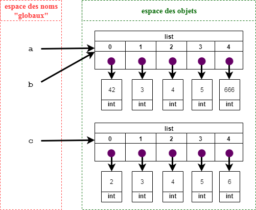 bdonc l'effet aurait été le même avec l'instructionb[0] = 42.- Dans les lignes suivantes, on voit que les modifications faites sur