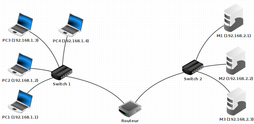 À côté du réseau construit dans la partie précédente, construire un nouveau réseau d'adresse 192.168.2.0/24 et composé d'un switch et des machines M1 (IP 192.168.2.1), M2 (IP 192.168.2.2) et M3 (IP 192.168.1.3) :