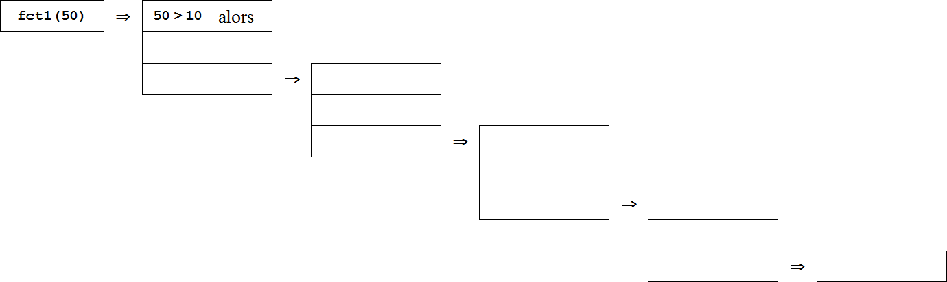 fct2(10)donc on met en attenterectangle(20)en priorité devantrectangle(30)en priorité devantrectangle(40)en priorité devantrectangle(50); 10n'est pas strictement supérieur à10, les appels se terminent.- On dépile par ordre de priorité en traçant dans l'ordre