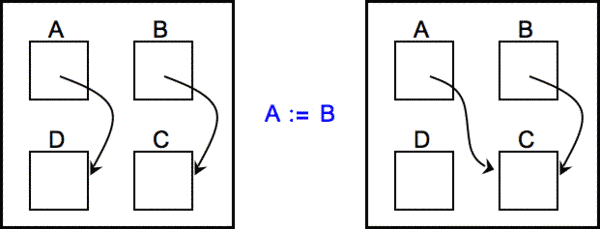 Par exemple, l'instruction A := B modifie la flèche qui part de A. Après l'exécution de cette instruction, la flèche qui part de A est modifiée pour arriver au même endroit que la flèche qui part de B.