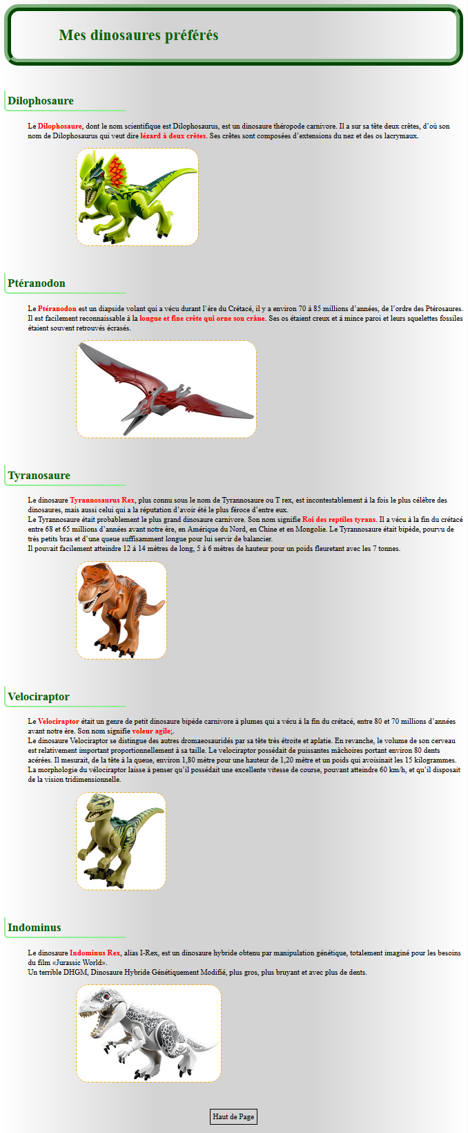 la page d'accueil d'un mini-site sur les dinosaures. Vous trouverez ci-dessous