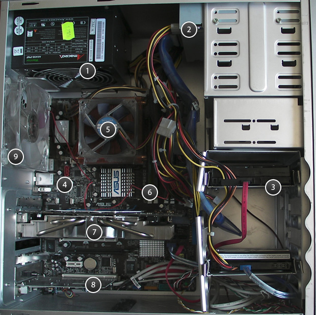 télécharger ici.L'image ci-dessous met en valeur différents composants placés à l'intérieur de l'unité centrale d'un ordinateur. En faisant les recherches nécessaires sur internet et/ou en ouvrant physiquement une unité centrale, identifier ces différents éléments repérés par un numéro puis indiquer leur fonction.